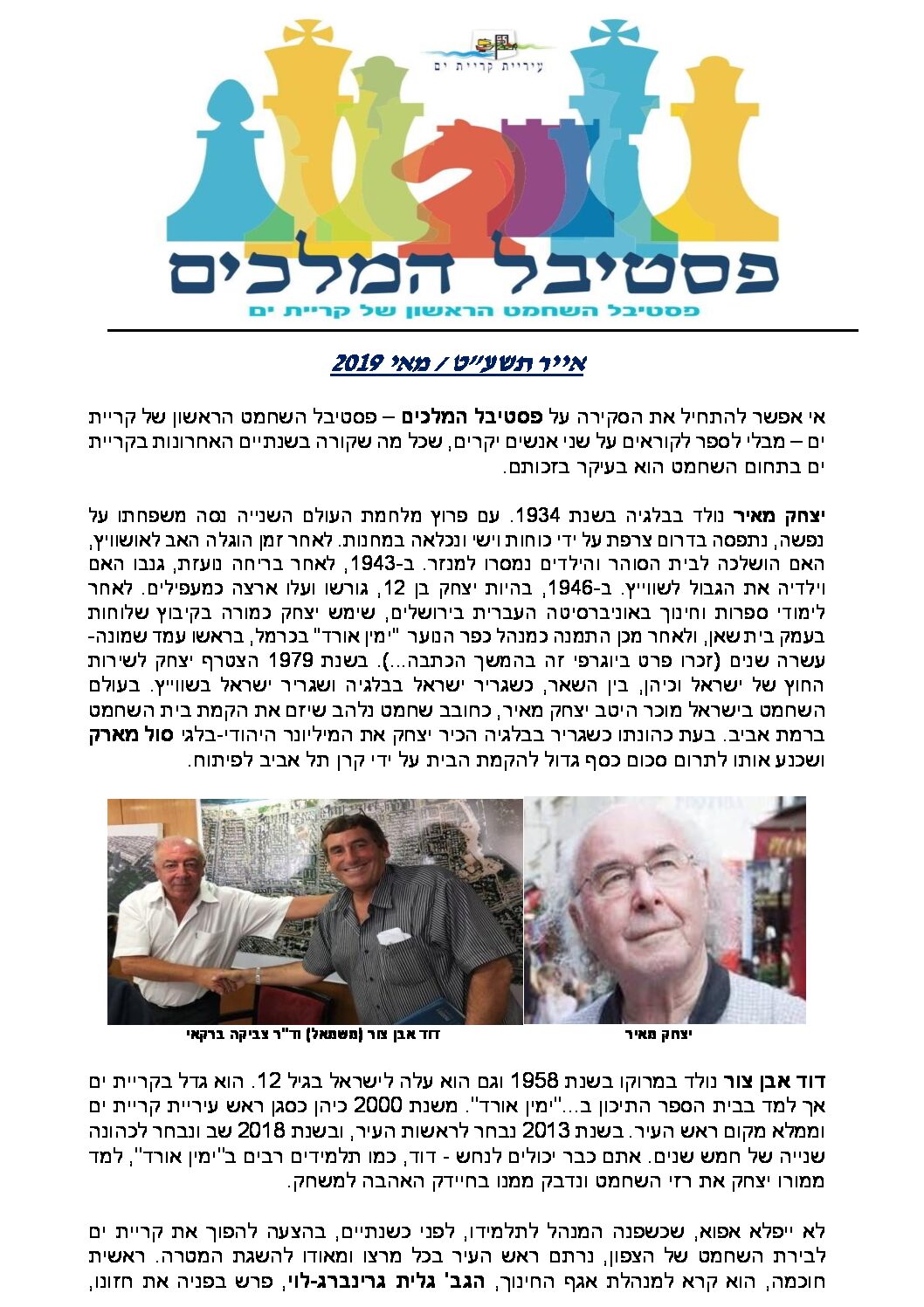 אי אפשר להתחיל את הסקירה על פסטיבל המלכים – פסטיבל השחמט הראשון של קריית ים – מבלי לספר לקוראים על שני אנשים יקרים, שכל מה שקורה בשנתיים האחרונות בקריית ים בתחום השחמט הוא בעיקר בזכותם.